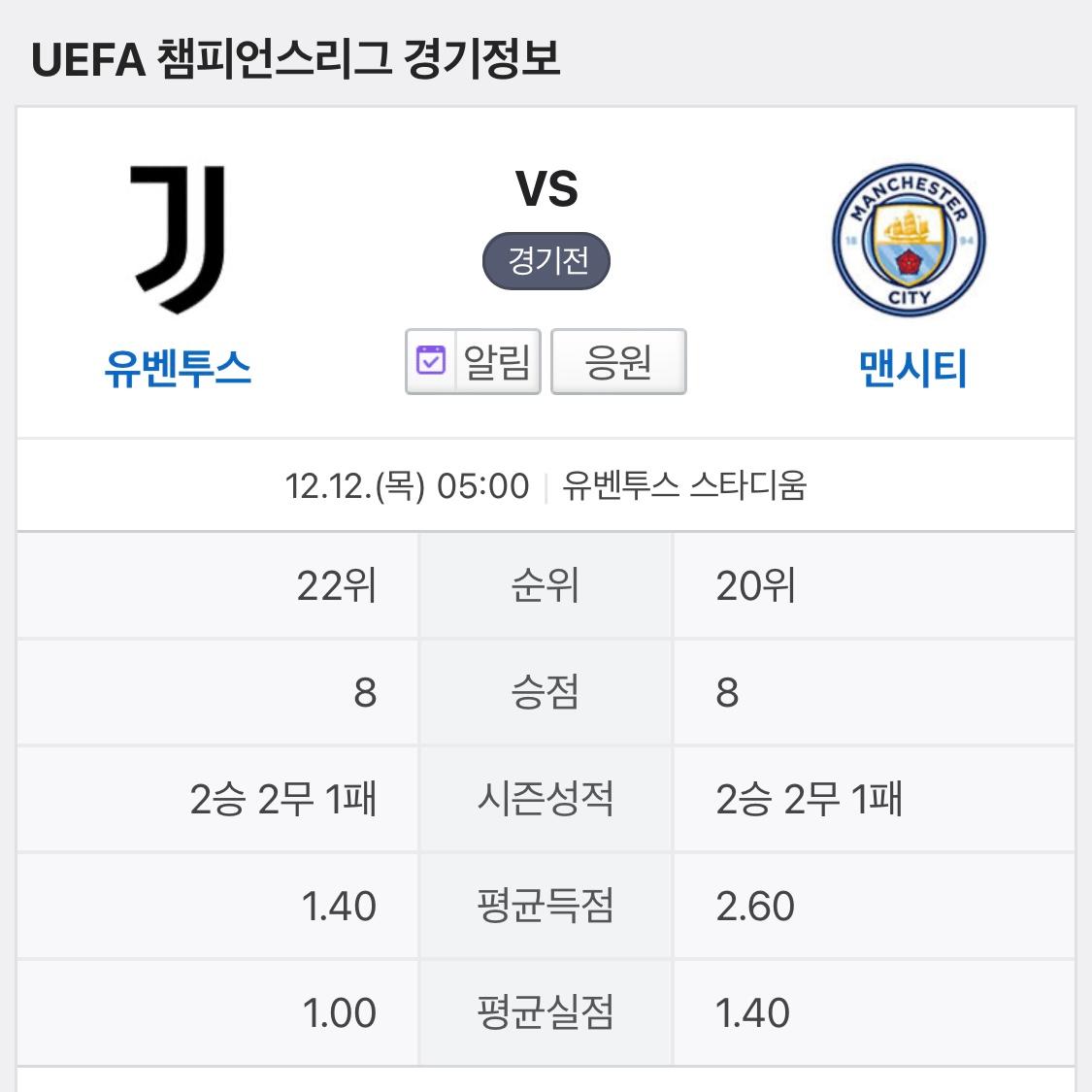 - 유벤투스의 약점: 공격 전개 속도가 다소 느릴 수 있으며, 맨시티와 같은 팀을 상대할 때 공격력에서 다소 밀리는 경향이 있습니다.